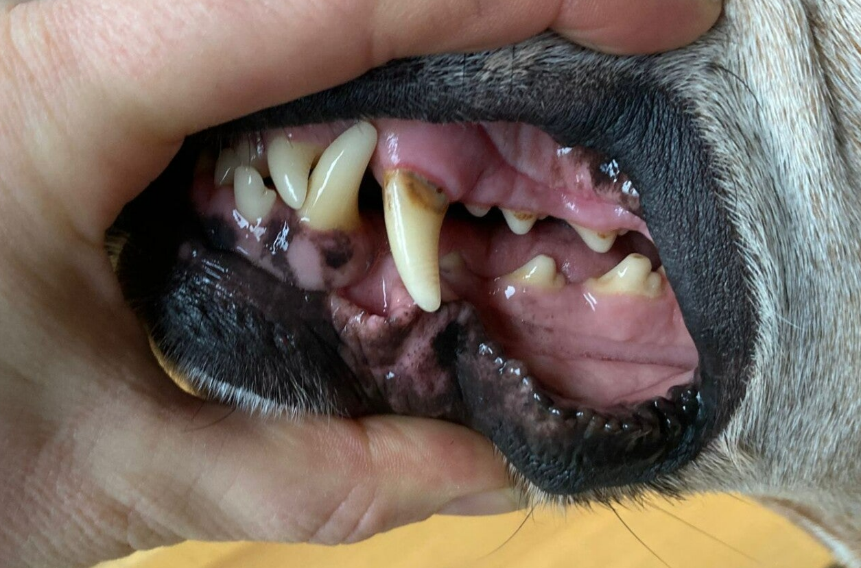 Tanden met tandplak en beginnende tandsteenvorming. Het slijmvlies boven de hoektand is wat ontstoken. Je ziet een donker randje boven de hoektand ontstaan.